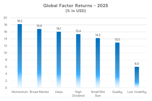 Momentum posted the highest factor return in 2025 at 18.2% and retaining top billing from the year prior, though at a far more moderate pace compared with 2024’s exceptional 44.3%. Last year, the factor only slightly outperformed the broader market which returned 16.9%. Momentum continued to be supported by ongoing investor enthusiasm for AI, strong earnings for technology companies, a bull run for commodities, and a risk-on attitude by investors throughout much of the year despite periods of volatility stemming from the new US trade regime. Broad market returns, meanwhile, benefited from easing inflation and declining global interest rates throughout the year that helped lift total market sentiment.