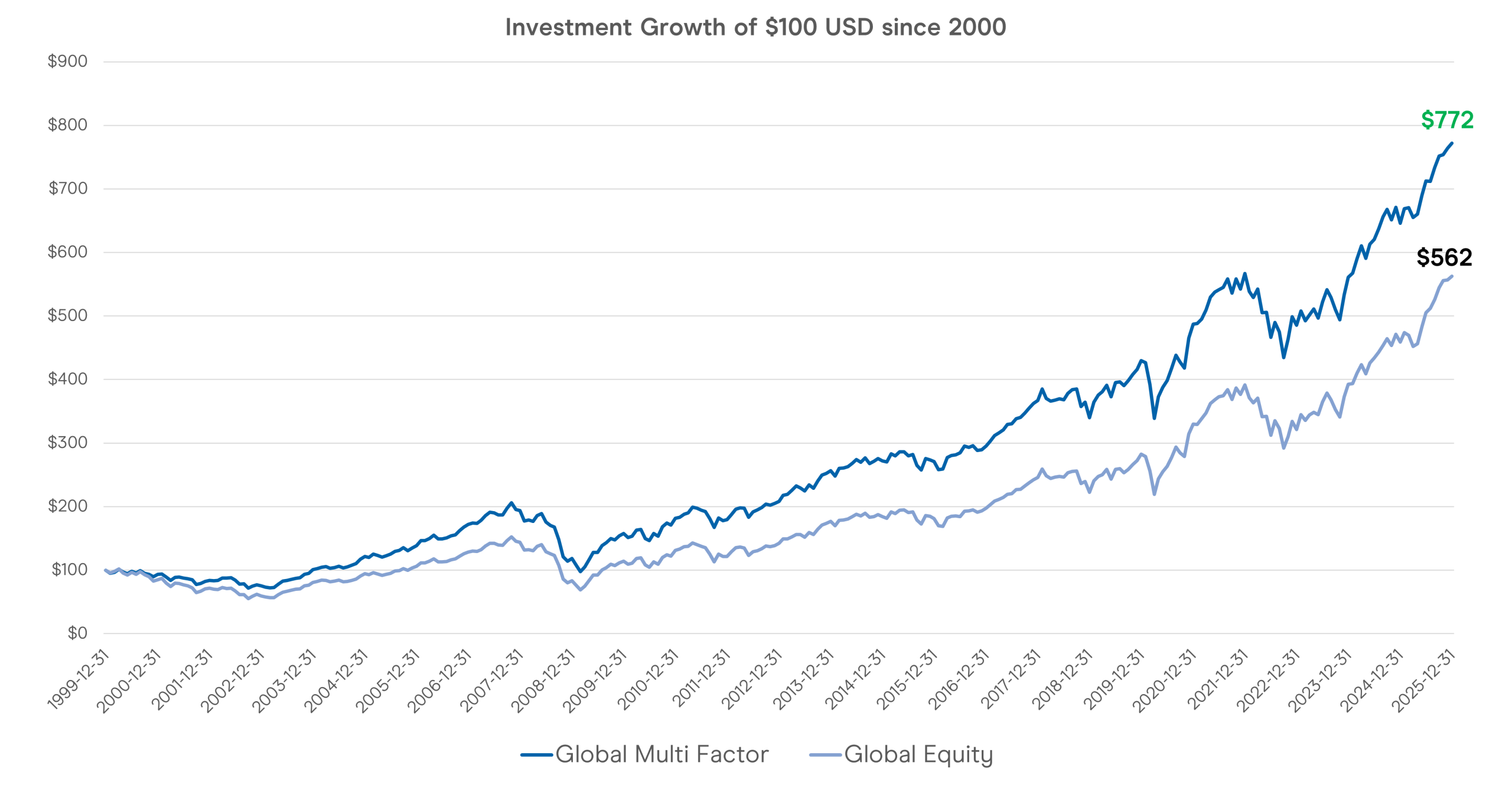 While the outperformance of any one factor in any given year is unpredictable (making “factor timing” a mug’s game) diversifying across factors and systematically rebalancing allocations can augment portfolio returns over time. As illustrated by the following graph depicting the cumulative growth of $100 USD invested since 2000, the global multi-factor portfolio has created an incredible 37% more wealth than the global broad market index (see Appendix I for the indexes used and disclaimer).